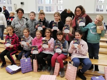 Am Ende erhielten sie als Geschenk das von Katharina Mauder herausgegebene Buch "Schläfst du noch, oder träumst du schon?" das alle Geschichten der Kinder und Fotos enthält.