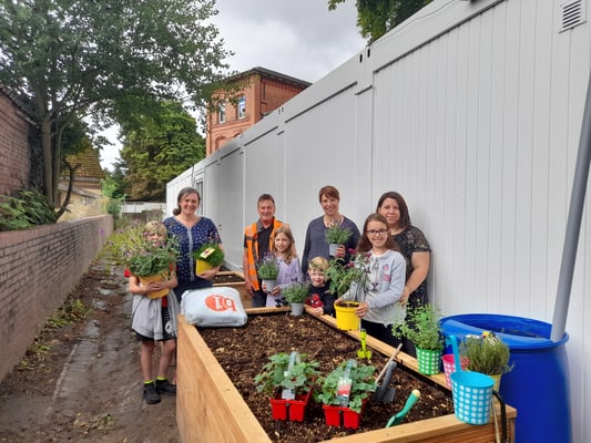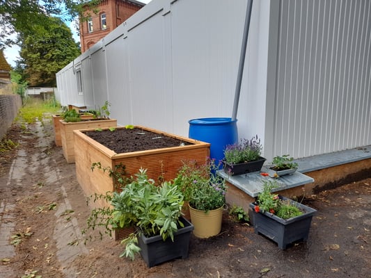 Mit Hilfe von Franko Stein vom Fachdienst Umwelt, Frau Schwabe, Frau Reimann, Frau Schöning vom Förderverein, Frau Vettikuzha sowie einigen Kindern konnten die Beete am 26.07.2022 bepflanzt werden. Neben bienenfreundlichen Pflanzen wie Salbei, Lavendel und Flieder wurden auch verschiedene Kräuter und Gemüse gepflanzt.